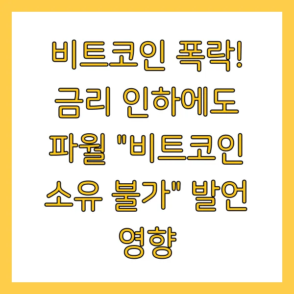 연준의 금리 인하 발표에도 비트코인이 폭락하며 가상화폐 시장에 충격을 안겨주었어요. 파월 의장의 "비트코인 소유 불가" 발언은 시장의 불확실성을 증폭시켰죠. 이번 사태는 향후 비트코인 시장에 어떤 영향을 미칠까요? 금리, 인플레이션, 정부 규제 등 거시경제적 요인과 가상화폐 시장 자체의 변수를 분석하며 앞으로의 전망을 살펴보도록 하겠습니다. (핵심 키워드: 비트코인, 파월, 금리 인하, 폭락; 서브 키워드: 가상화폐, 시장 전망, 투자 전략)