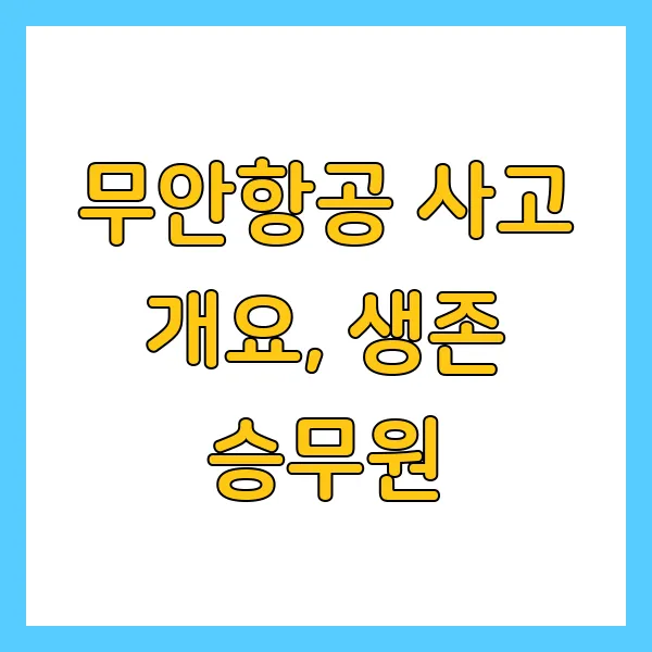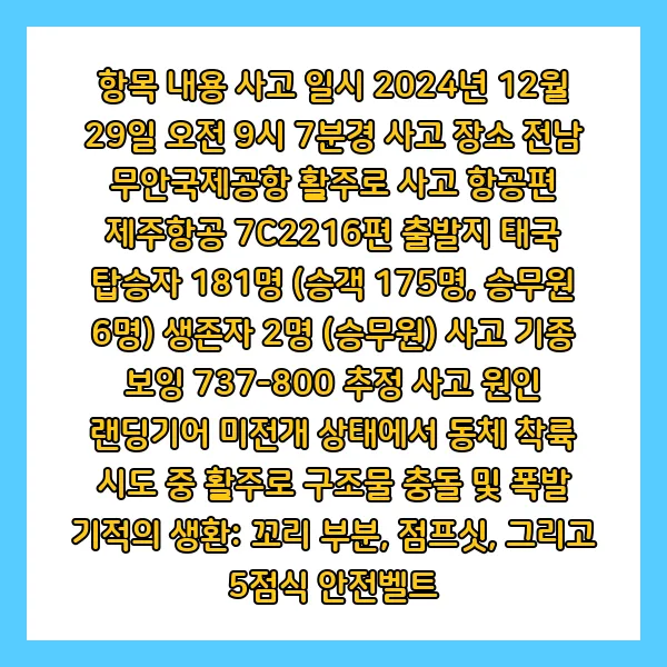 항목 내용 사고 일시 2024년 12월 29일 오전 9시 7분경 사고 장소 전남 무안국제공항 활주로 사고 항공편 제주항공 7C2216편 출발지 태국 탑승자 181명 (승객 175명, 승무원 6명) 생존자 2명 (승무원) 사고 기종 보잉 737-800 추정 사고 원인 랜딩기어 미전개 상태에서 동체 착륙 시도 중 활주로 구조물 충돌 및 폭발 기적의 생환: 꼬리 부분, 점프싯, 그리고 5점식 안전벨트